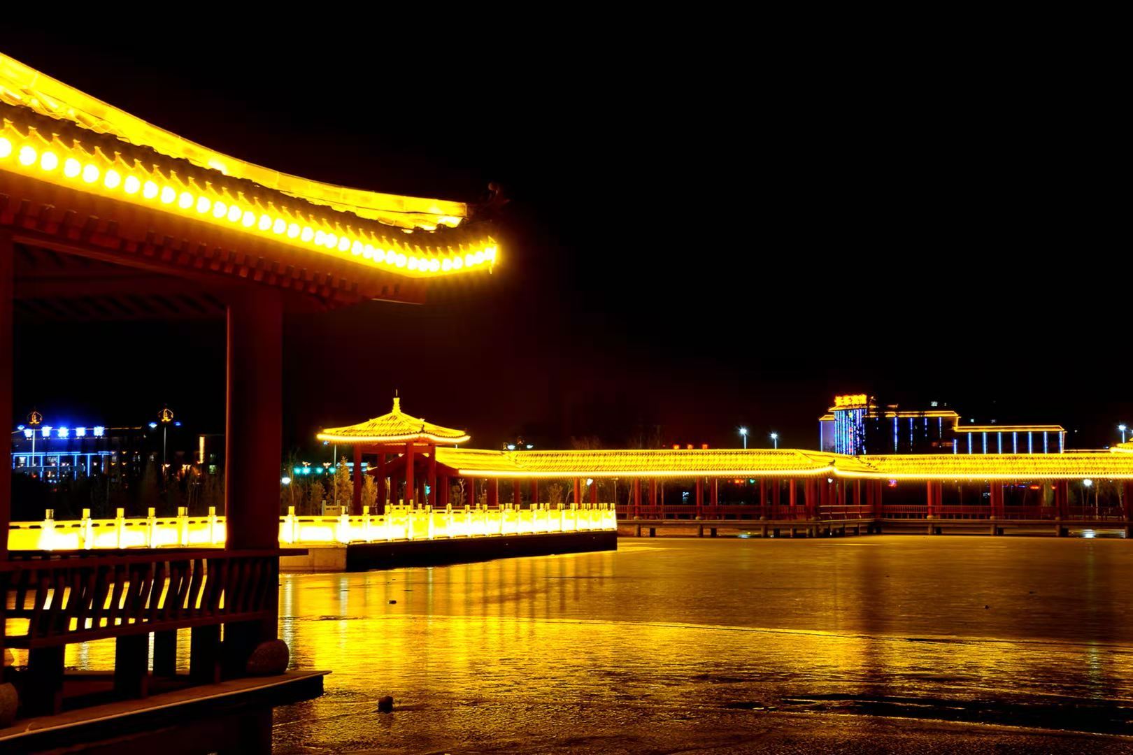 熟睡了的渊泉湖上倒映着各色霓虹灯。一阵风吹来,画面破碎了,散成小碎片在湖面上闪动着……